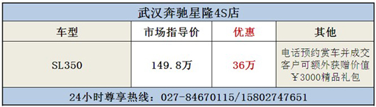 5月29日—6月8日,武汉星隆奔驰“每周一款特价车”活动火热进行中,即日起到汉阳龙阳大道购SL350车型享现金直降360000元钜惠,另可享0利息0手续费金融分期购车途径及二手车置换购车途径!对SL350感兴趣的车友可到店详询或拨打武汉星隆奔驰24小时尊享热线027-84670115/15802747651了解具体购车详情!电话预约赏车并成交客户可额外获赠价值3000元精品礼包!