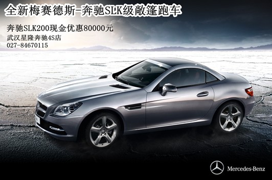 自由之路,御风而行!梅赛德斯-奔驰全新SLK级敞篷跑车武汉奔驰星隆4S店现车到店,即日起至2013年6月15日购SLK200即可享80000现金优惠,欢迎致电详询,到店赏车!