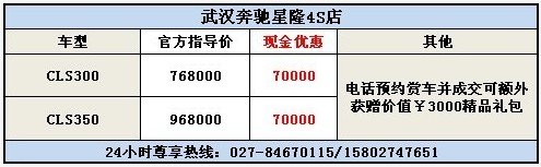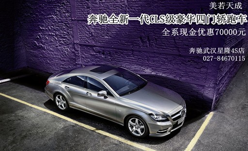 美若风云,动若天成,全新一代CLS级豪华运动四门轿跑车,武汉奔驰星隆4S店现车销售,端午节期间现金优惠70000元,欢迎电话预约到店赏车!