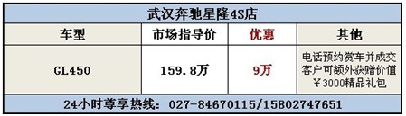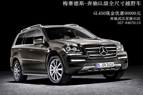 武汉奔驰星隆4S店奔驰GL 450 Grand版现车到店,现在购车即享现金90000元优惠,数量有限。欢迎电话预约到店赏车,活动截止时间:2013年6月30日。