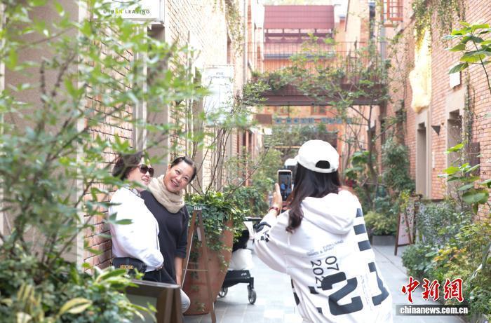 11月4日,湖北武汉,游客在延庆里打卡拍照。中新社记者 张畅 摄