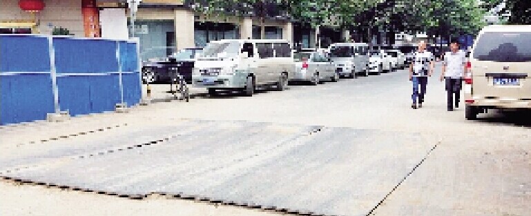 一施工单位在未经审批情况下,夜间开挖江汉区唐蔡路路面,不料挖破了地下污水管道,一时难以修复,导致唐蔡路昨日上午大堵车。经紧急铺设钢板(如图),昨日上午10时许交通才恢复正常。