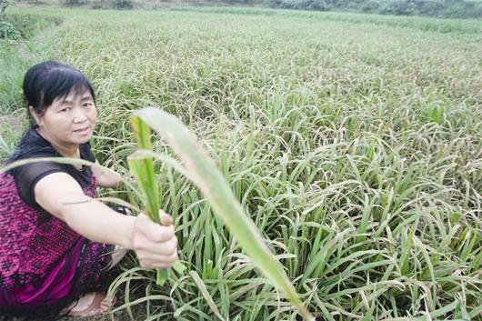 大约1个月前开始,鸦鹊岭镇梅店村三组17户村民家中的水稻开始出现大面积死亡,14日下午,记者来到当地采访时,村民们直指向上游一家塑料厂,称其排污所致。