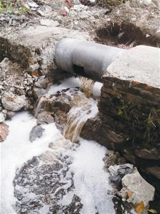 最终,工作人员在沙窝乡水港村19组附近的桥下找到了破裂的排水管道。经仔细观察,排水管道下方被截破,有红褐色的水排出,管道附近出现大量白色泡沫。工作人员随即对管道排出的水取样。