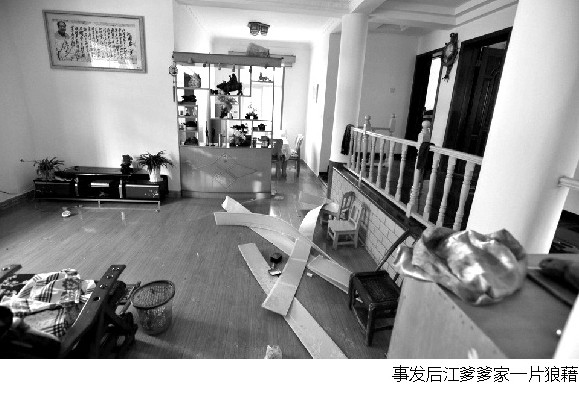 街坊邻居们介绍,当时听见爆炸声,最初还以为是旁边工地在放炮。因为爆燃产生的冲击力很大,楼道里紧贴着江爹爹家的一根自来水供水管也被震裂,喷涌而出的自来水漫得整个楼道都是。