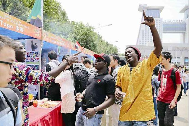 鼓声未落,劲舞又起。刚果(金)、南非等国的姑娘小伙们,听着嘻哈音乐,边烤肉边扭腰(如图)。一些留学生在展棚边跳起舞蹈,并作狩猎状,引得不少中国学生跟着舞起来。