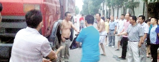 加入到抓小偷行列的人越来越多。大伙追至章林路时,因此处房屋建设不规整,道路宛如迷宫,20多名居民分头堵住各条岔路出口。最后,成功将男子逼困在一辆红色货车旁(如图)。哪知,该男子突然掏出一把20多厘米的小刀来回舞动,并趁居民不备,又一次从人群中逃离。