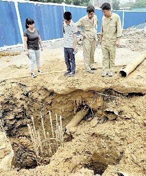 记者进入工地现场看到,地面钻了多口深井,井下约3米处,有多根管道被挖断(如图)。现场处置的燃气公司抢修人员介绍,被挖断的是一根直径250毫米的天然气管道,其它的是废弃管道。