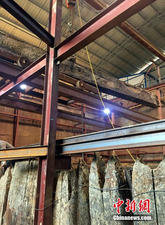 考古人员通过航吊方式搬运笨重的主棺椁板。 郭晶 摄