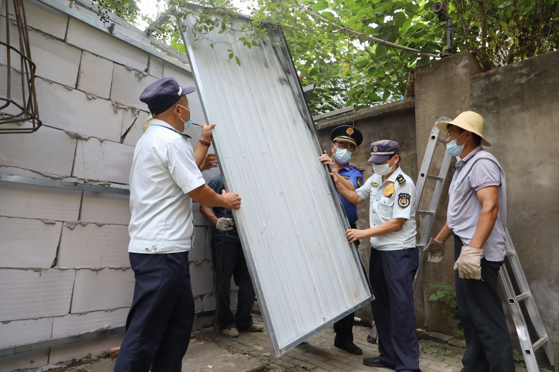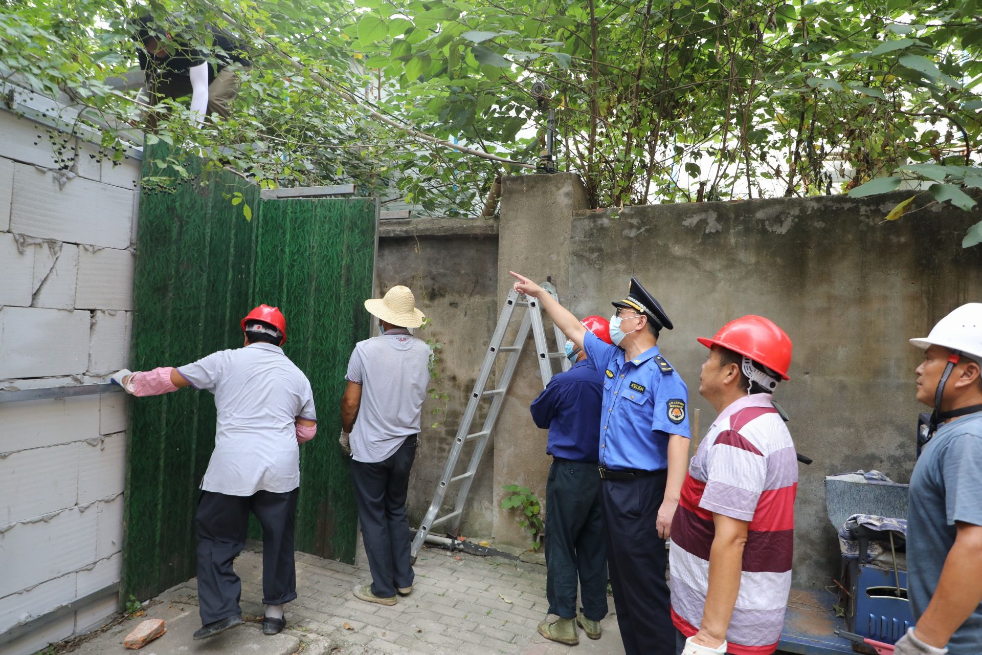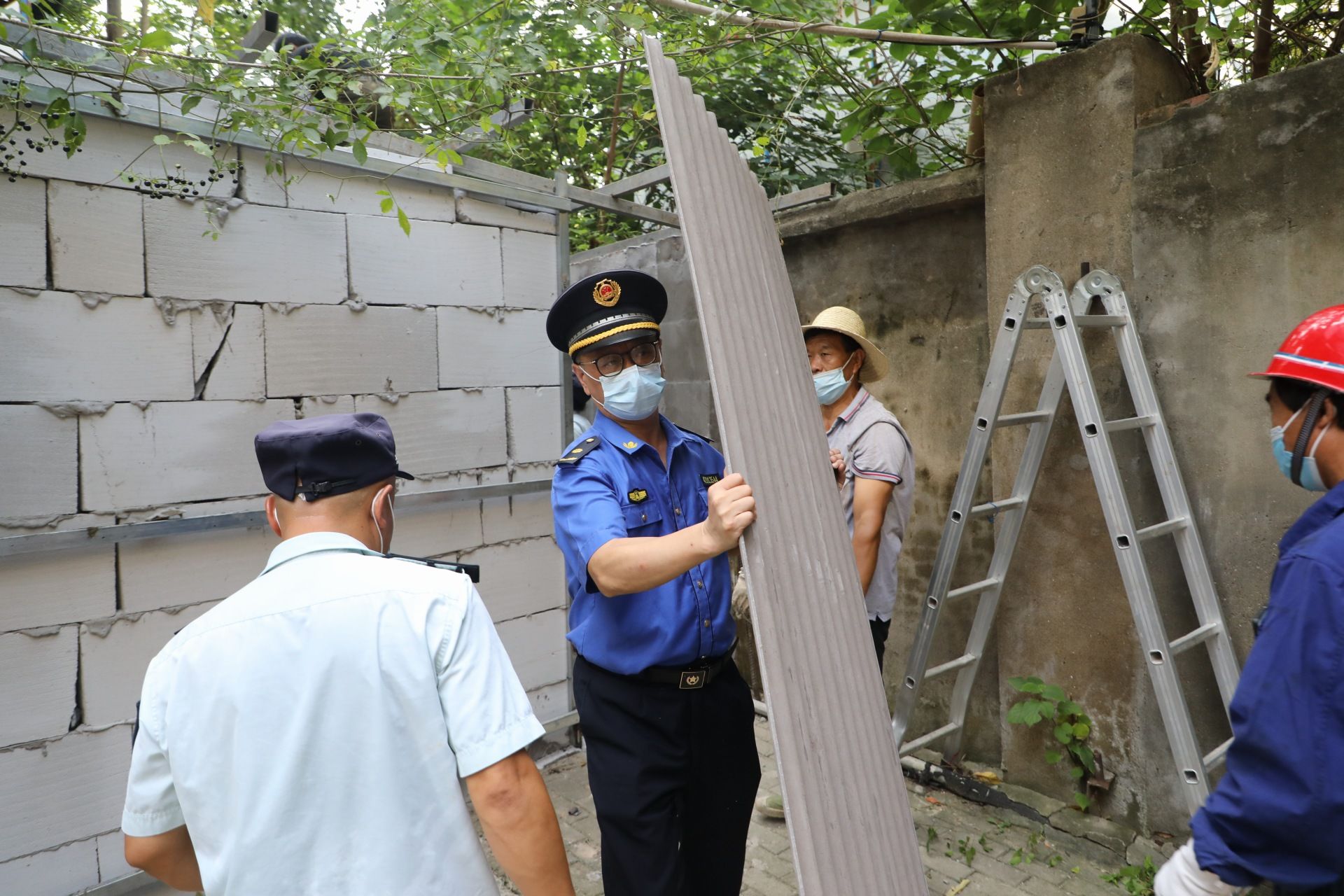 上午9时,执法队员已拉好警戒线,指挥居民清理警戒区域内的车辆和物品,准备拆除倒口南村149号1楼旁的违法建设。从外观上看,城管部门要拆除的此处违法建设仅仅是一面挂了塑料绿草皮的墙,待执法人员搬开“伪装”的绿皮墙后,却发现墙后别有洞天:露出了采用钢构和方砖搭起的一座房屋,该房屋宽约1.5米,建设在楼栋至小区围墙间,将所有的公共道路侵占。