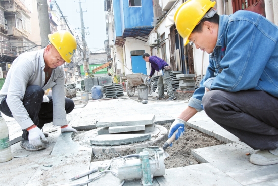 昨日,沙市黄家塘社区一老旧小区内,施工人员在铺设路面砖,以改善该片区居民居住环境。据了解,该工程属于沙市区2020年老旧小区改造项目之一。本轮沙市区老旧小区改造工程完工后,将极大地改善老旧小区人居环境,提升城市形象。(记者潘路摄)