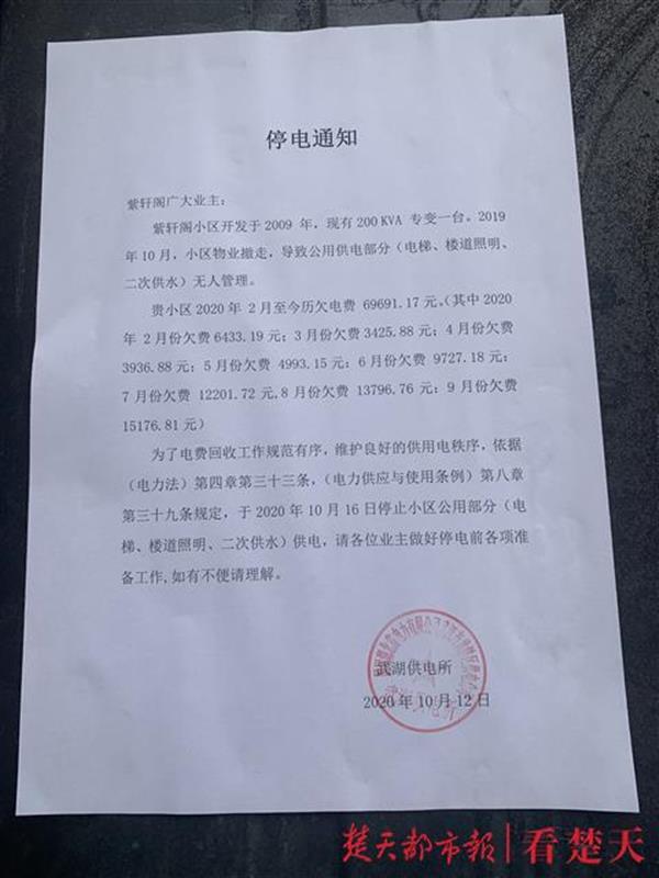开具停电通知的是黄陂区供电公司武湖供电所,称紫轩阁(紫轩雅苑别名)小区开发于2009年,现有200千伏安专变一台。2019年10月,小区物业搬走,导致公用供电部分(电梯、楼道照明、二次供水)无人管理。小区今年2月至今历史欠费69691.17元。为了电费回收规范有序,供电部门于10月16日停止小区公用部分(电梯、楼道照明、二次供水)供电,请业主做好准备。