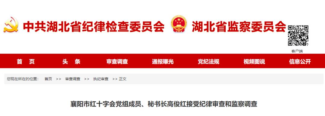 据襄阳市纪委监委消息:襄阳市红十字会党组成员、秘书长高俊红涉嫌严重违纪和职务违法,目前正接受襄阳市纪委监委纪律审查和监察调查,并被采取留置措施。