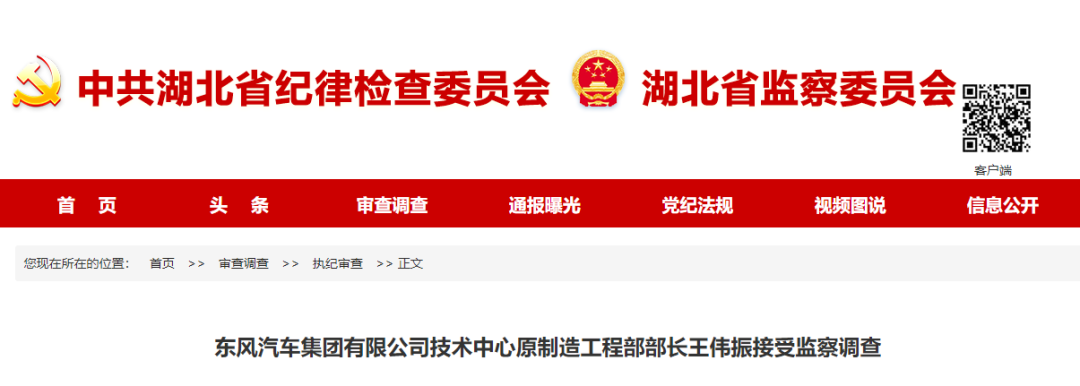 据十堰市监委消息:东风汽车集团有限公司技术中心原制造工程部部长王伟振涉嫌严重职务违法,经国家监委驻东风汽车集团有限公司监察专员办公室移交,目前正接受十堰市监委监察调查,并被采取留置措施。东风公司纪委就王伟振涉嫌严重违纪问题,已予党纪立案审查。