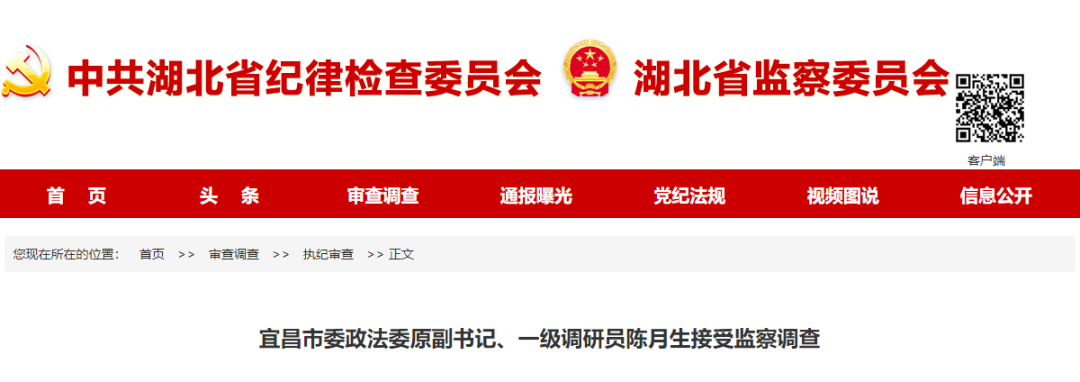 据荆州市监委消息:宜昌市委政法委原副书记、一级调研员陈月生涉嫌严重职务违法,经湖北省监委指定管辖,目前正在接受荆州市监委监察调查,并被采取留置措施。