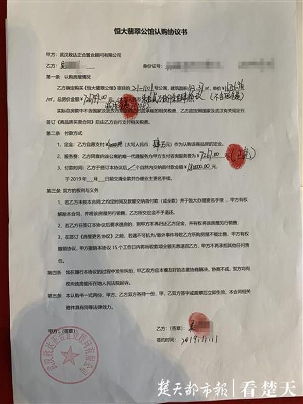 吴先生称,为了孩子能就近上学,他在汉阳四新南路某楼盘买套房。去年11月11日,他与武汉致达正合置业顾问有限公司签了房屋认购协议书,购买一套面积43.37㎡公寓,单价为每平方16756.96元,服务费7267元,房款总额726749元。