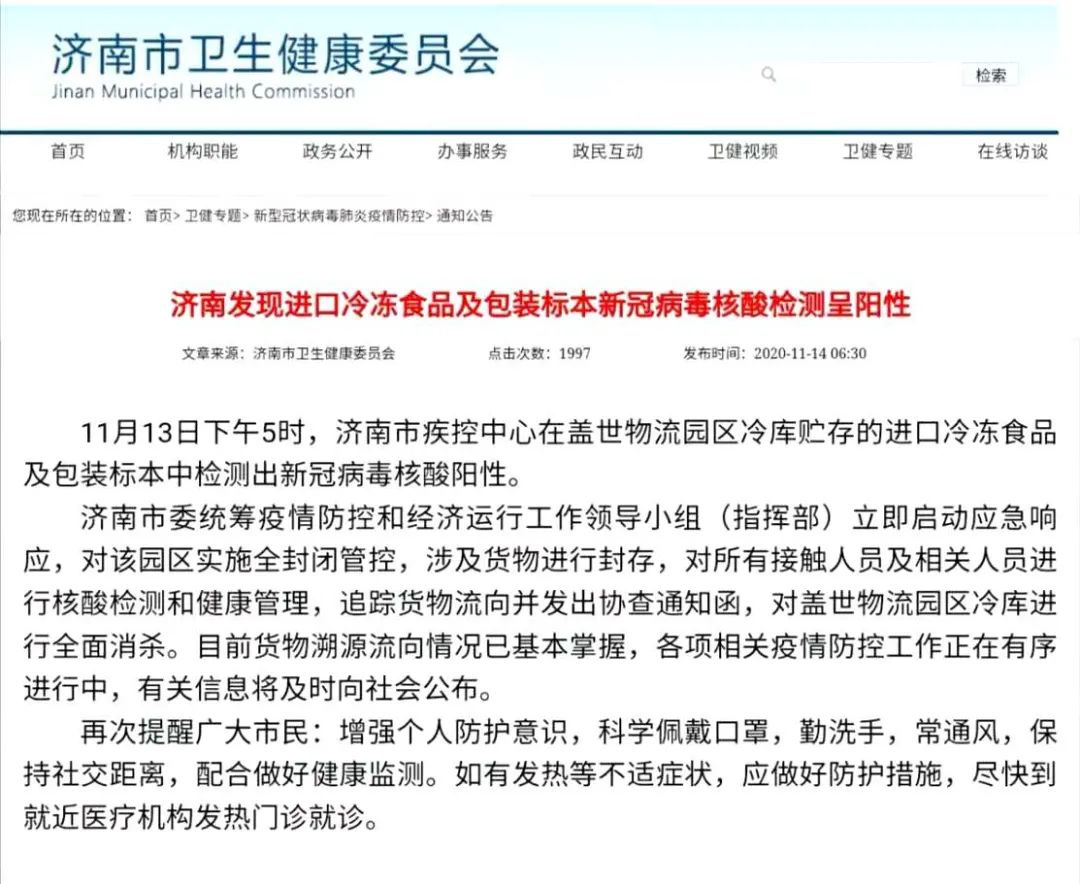 据济南市卫生和健康委员会14日通报,11月13日下午5时,济南市疾控中心在盖世物流园区冷库贮存的进口冷冻食品及包装标本中检测出新冠病毒核酸阳性。
