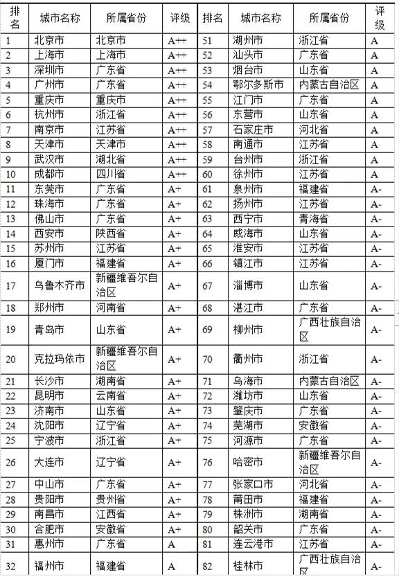 在地域分布上,排行榜前十位城市有7个城市来自京津冀、长三角和珠三角三大城市群,重庆、成都和武汉等3个西南和中部城市也表现优异,充分体现国家区域均衡发展战略。