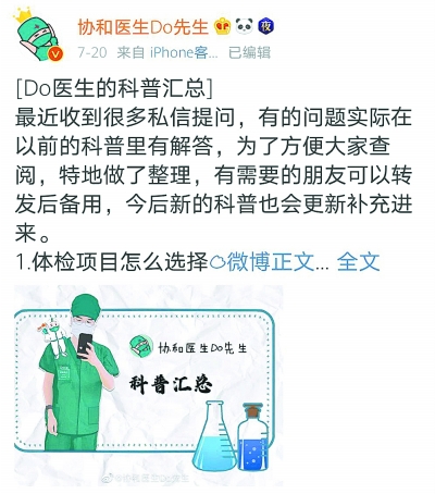 Do先生的置顶微博就是一篇科普汇总,集纳了粉丝私信提问的热点问题,包括:体检项目怎么选择、手脚冰凉是什么原因、柠檬水能不能美白等日常生活中的常见问题,目前已有61条常见科普集锦。