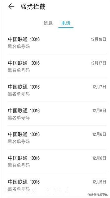 网友“河边草丛”将10016拉入黑名单号码,他晒出的通话记录显示,从12月5日至18日,一共拦截了7次10016电话。他留言说:“我也拦截了,天天推荐换5G套餐,我住在黄陂农村地区,家里根本就没有5G信号覆盖。”