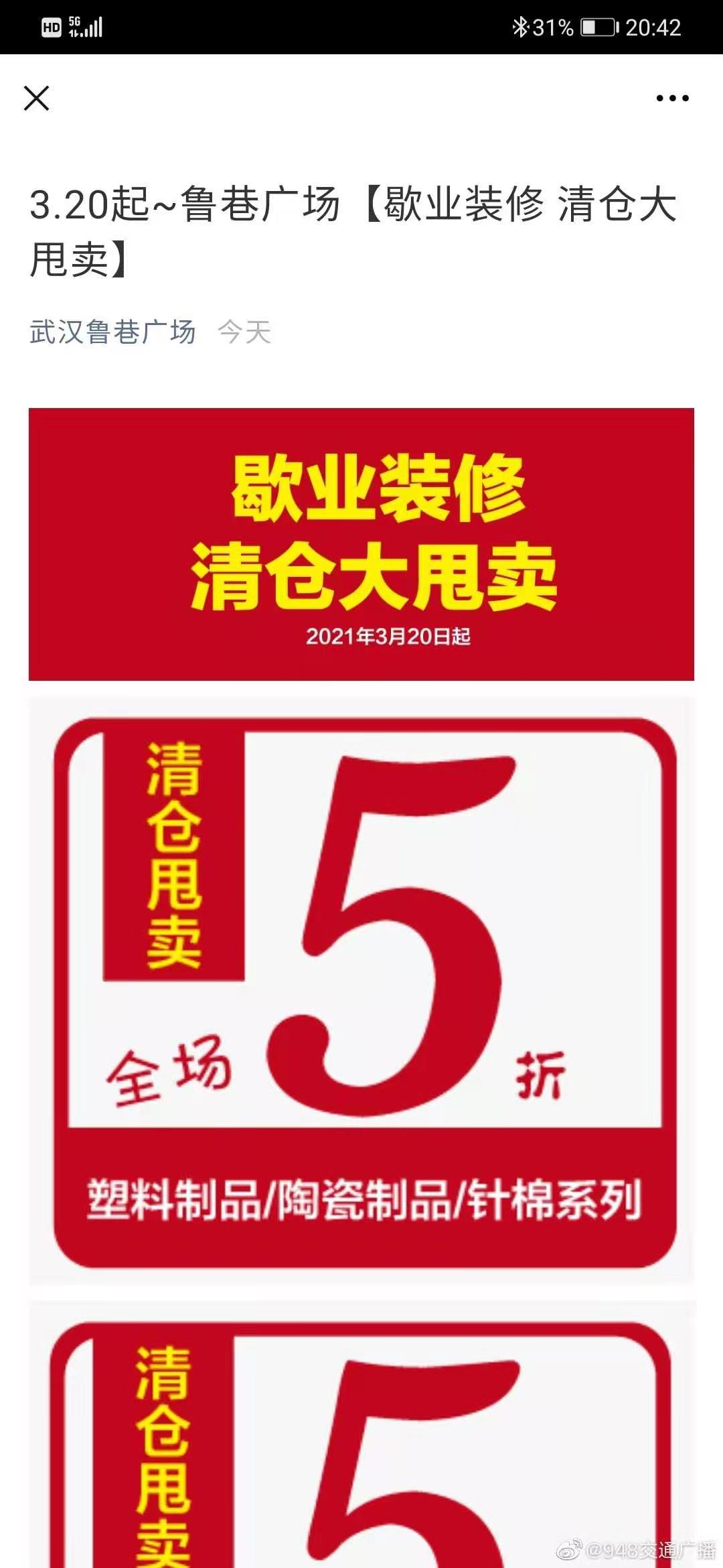 与此同时,武汉鲁巷广场的官方微信上也推送了“歇业装修 清仓大甩卖”的推文。