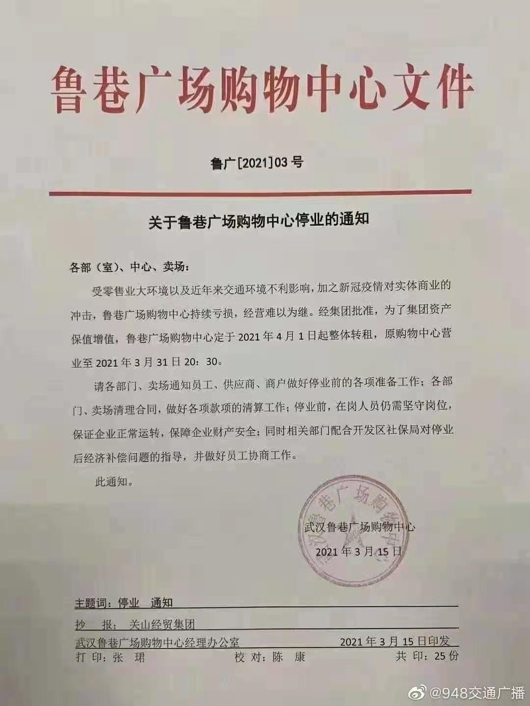在这份流传出的文件中,记者看到通知是由武汉鲁巷广场购物中心于3月15日发出,文中写道:受零售业大环境以及近年来交通环境不利影响,加之新冠疫情对实体商业的冲击,鲁巷广场购物中心持续亏损,经营难以为继。经集团批准,为了集团资产保值增值,鲁巷广场购物中心定于2021年4月1日起整体转租,原购物中心营业至2021年3月31日20:30。请各部门、卖场通知员工、供应商、商户做好停业前的各项准备工作;各部门、卖场清理合同,做好各项款项的清算工作;停业前,在岗人员仍需坚守岗位,保证企业正常运转,保障企业财产安全;同时相关部门配合开发区社保局对停业后经济补偿问题的指导,并做好员工协商工作。