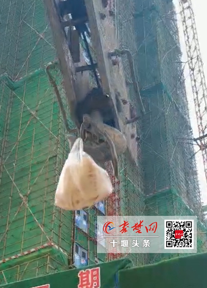 近日,有网友向秦楚网记者发来一张某手机短视频APP的截图,图片之中,一个巨大的塔吊钩子上挂着一只小巧的白色塑料袋,正升向半空中。从截图上配的文字可以看出,这是竹山某工地塔吊师傅在取外卖。