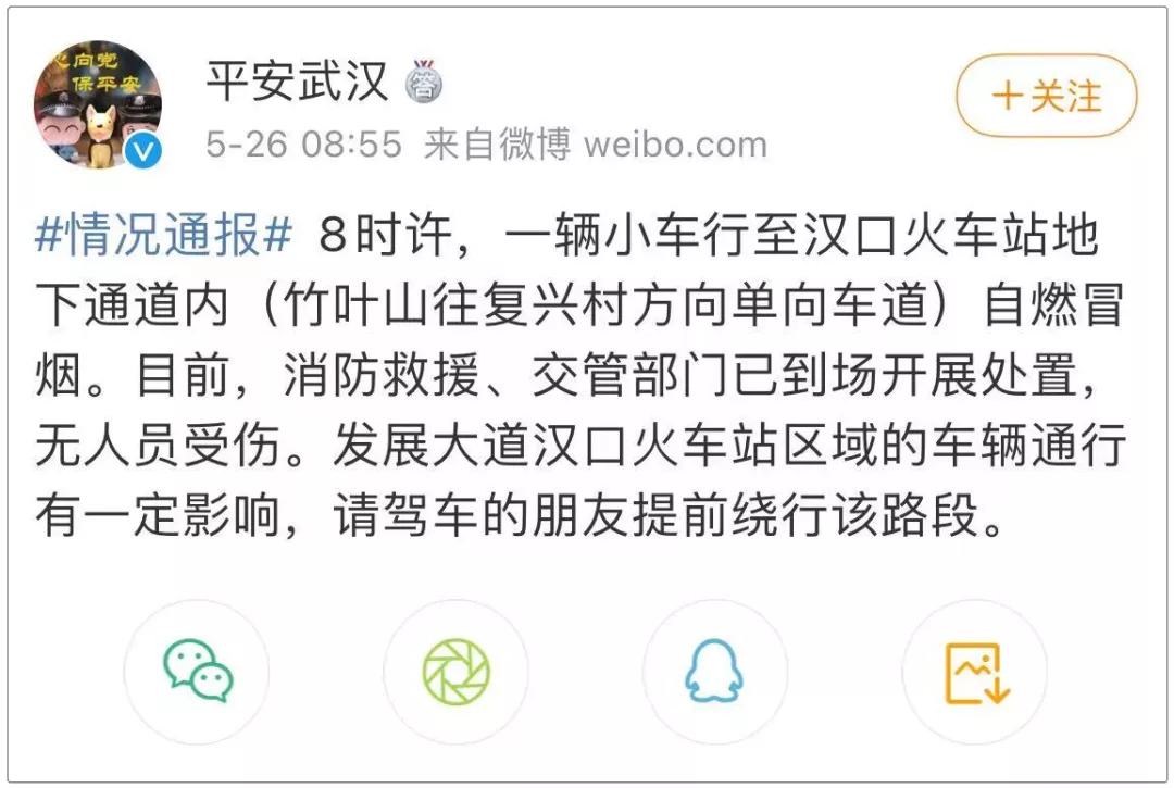 9时10分,数辆消防车全部进入地下通道,通道内的车辆已全部疏散,自燃车辆的明火基本扑灭。江汉交警对地面层车辆管制逐步解除。