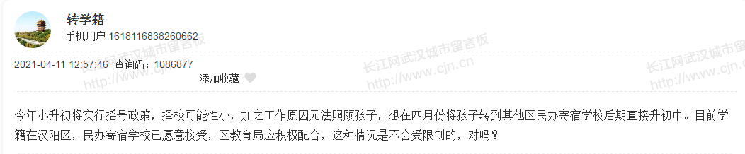 今年小升初将实行摇号政策,择校可能性小,加之工作原因无法照顾孩子,想在四月份将孩子转到其他区民办寄宿学校后期直接升初中。目前学籍在汉阳区,民办寄宿学校已愿意接受,这种情况是不会受限制吧?