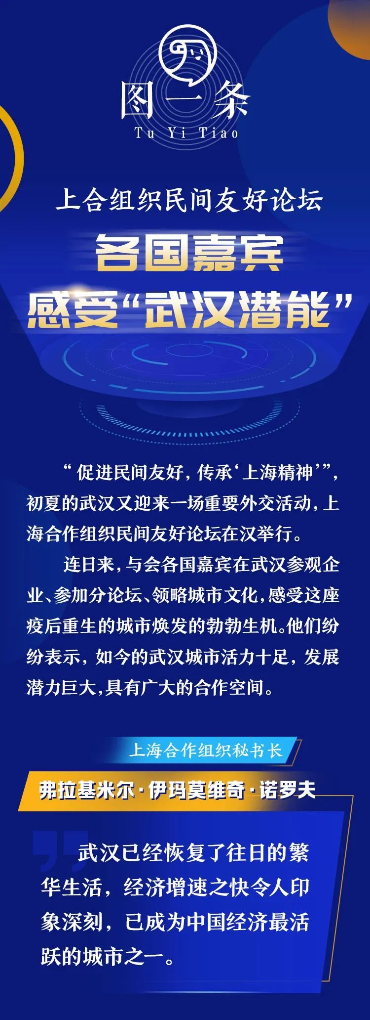 6月2日—4日,上海合作组织民间友好论坛在武汉举办。来自上合组织成员国、观察国、对话伙伴国的驻华代表等境内外代表约500人来汉参会。这次继4月12日外交部湖北全球特别推介活动之后,世界目光再次聚焦武汉。