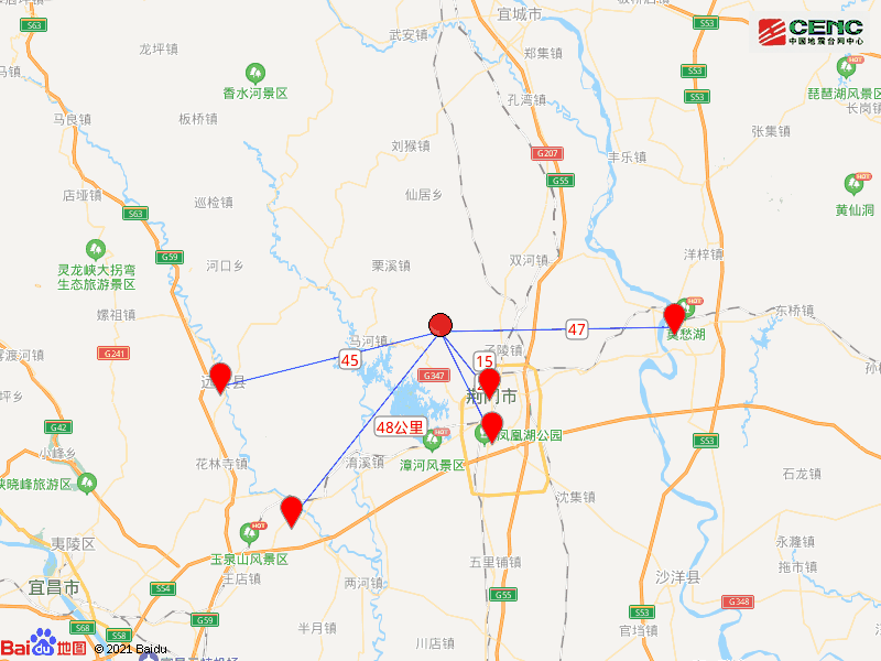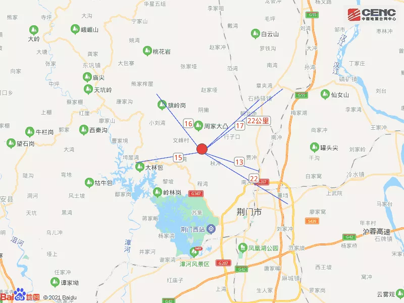 周边县城:震中距东宝区15公里、距掇刀区23公里、距远安县45公里、距钟祥市47公里、距当阳市48公里,距荆门市17公里,距武汉市225公里。