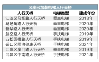 2018年7月,武汉首座拥有垂直电梯的人行天桥——江汉区马场路人行天桥投入试运行。截至目前,江汉区内共有5座天桥安装了15部电梯。