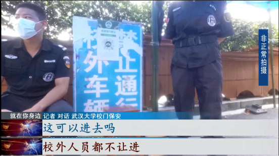 武汉大学真的不让外地游客进入吗?记者注意到武汉大学校门周边被围挡包围,在右边留有供行人和车辆通行的通道,有保安值守。