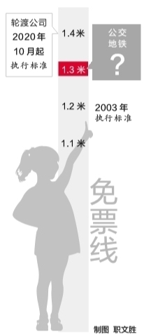 实际上,多地的免票线已经“长个儿”了。在北京、杭州、重庆、郑州等地,儿童乘公共交通的免票身高线已由1.2米提高至1.3米。从2020年10月起,武汉轮渡公司统一执行1.4米的儿童免票身高标准。