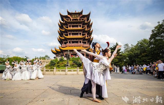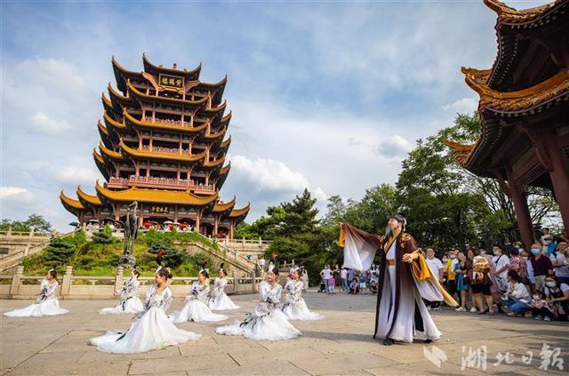 9月19日,游客们在武汉黄鹤楼公园观看文艺表演。当天是中秋假期的第一天,武汉各大景区迎来全国各地的游客。游客们在景区工作人员指引下扫健康码和测量体温后有序进入景区观光游览。(湖北日报全媒记者 柯皓 通讯员 江萌 摄)