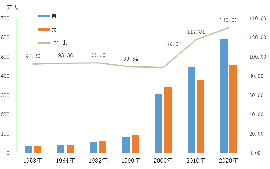 作为性别比最高的城市,2020年东莞全市常住人口中,男性人口为591.71万人,占56.53%;女性人口为454.95万人,占43.47%。总人口性别比由2010年第六次全国人口普查的117.81上升为2020年的130.06。
