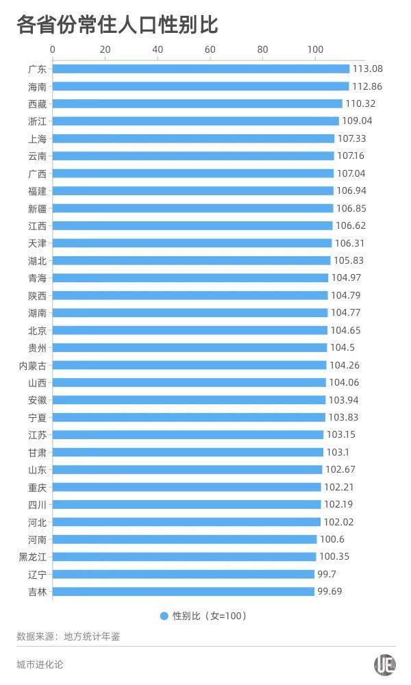 提出相同概念的还有制造业大市佛山,佛山的性别比为119.12,仅低于东莞(130.06)、深圳(122.43),排名第三。对此,佛山市统计局发布的分析指出,佛山常住人口性别比升高主要是受外市流入人口性别比较高的影响。