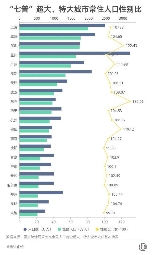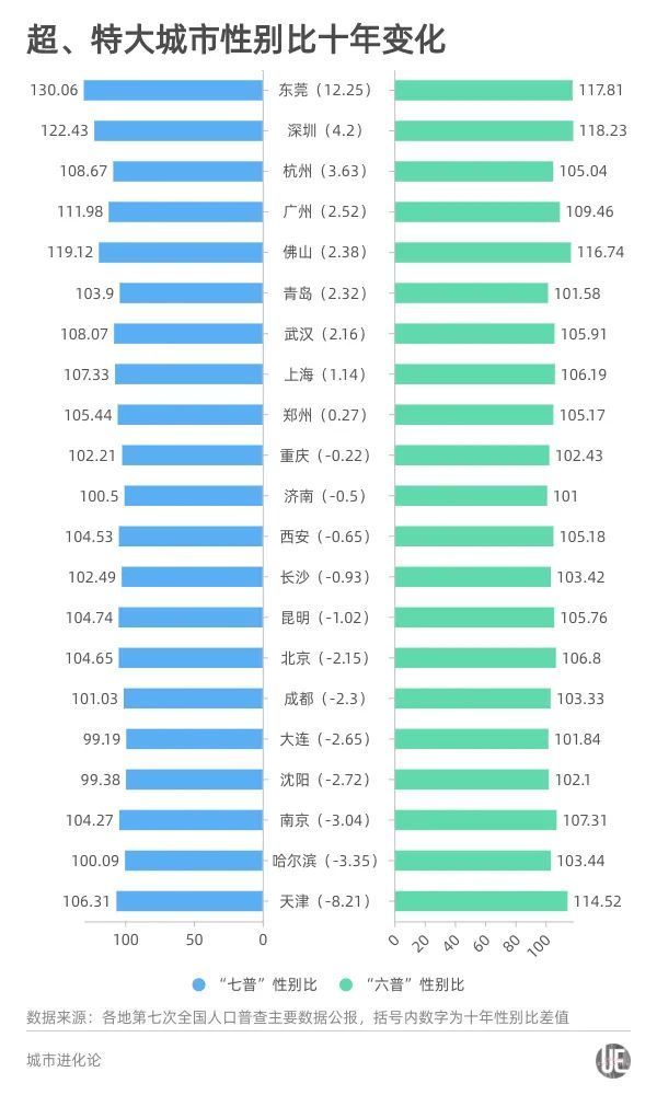 原标题:十年性别比变化,哪些超、特大城市在下降?