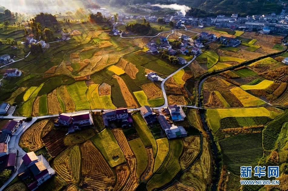 图为湖北省恩施土家族苗族自治州鹤峰县走马镇铺金叠翠,稻茶飘香。