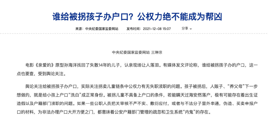 中纪委网站评论给拐卖儿童上户口