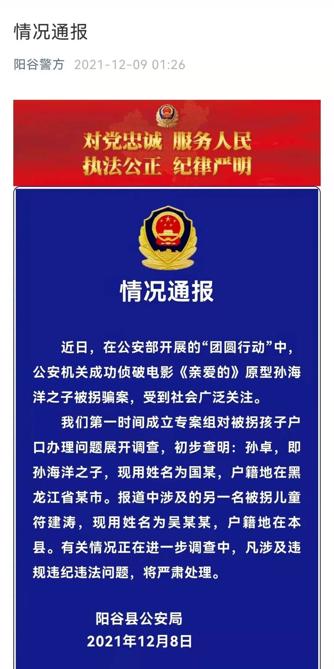 山东省聊城市阳谷县公安局12月8日发布情况通报,全文如下: