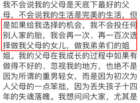 其中提到,“我不会说我的父母是天底下最好的父母,不会说我的生活是完美的生活,但是如果给我选择的机会,我会再一次、再一百次选择做我父母的女儿。”