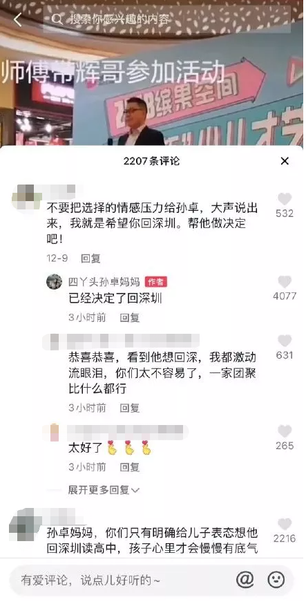 另外,孙卓妈妈彭四英近日也在社交平台称,孙卓决定回深圳。