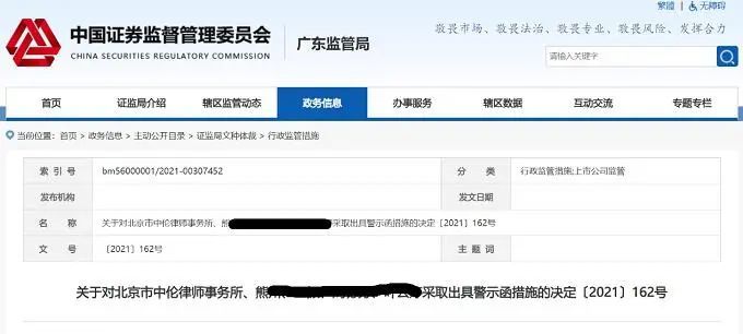 2021年12月23日, 广东证监局对北京市中伦律师事务所及熊某等人出具警示函。