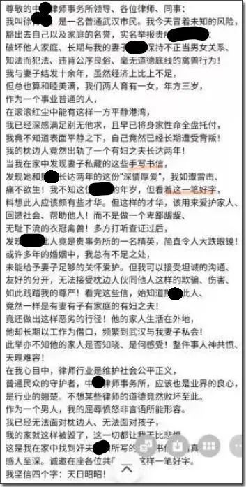 2月12日,有大V爆料,近日知名金牌头部大律所中×多位领导、员工突然收到群发邮件, 实名举报权益合伙人熊某,长期出轨人妻。
