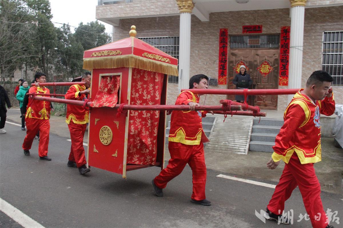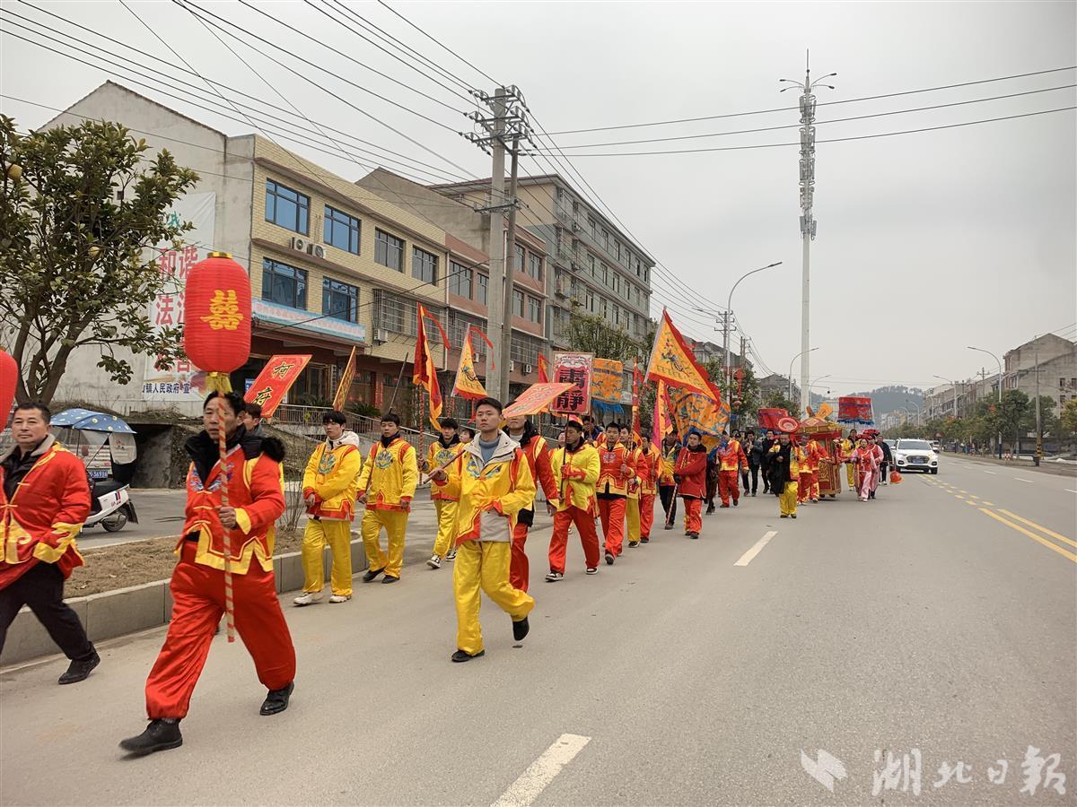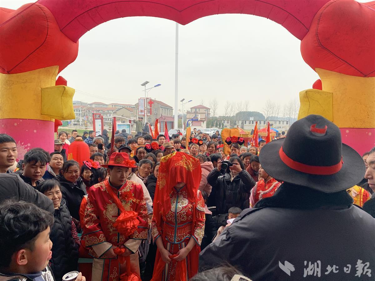 湖北日报讯(记者夏中华、通讯员胡倩、张惠)跨火盆、揭盖头、四跪八叩……2月10日,农历正月初十。在古玉连环、牌子锣的演奏下,鄂州市梁子湖区沼山镇桥柯村桥柯莊祖堂内,一对新人踏着红毯,缓缓入场,一场别开生面的非遗主题婚礼热热闹闹开启。