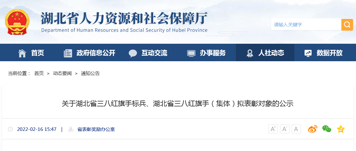 近日,湖北省人力资源和社会保障厅对2021年度湖北省三八红旗手标兵、湖北省三八红旗手、湖北省三八红旗集体名单进行公示。确定将王琳等10名个人作为“湖北省三八红旗手标兵”拟表彰对象,付阿丹等90名个人作为“湖北省三八红旗手”拟表彰对象,武汉市桥梁工程有限公司技术质量部等50个单位作为“湖北省三八红旗集体”拟表彰对象。