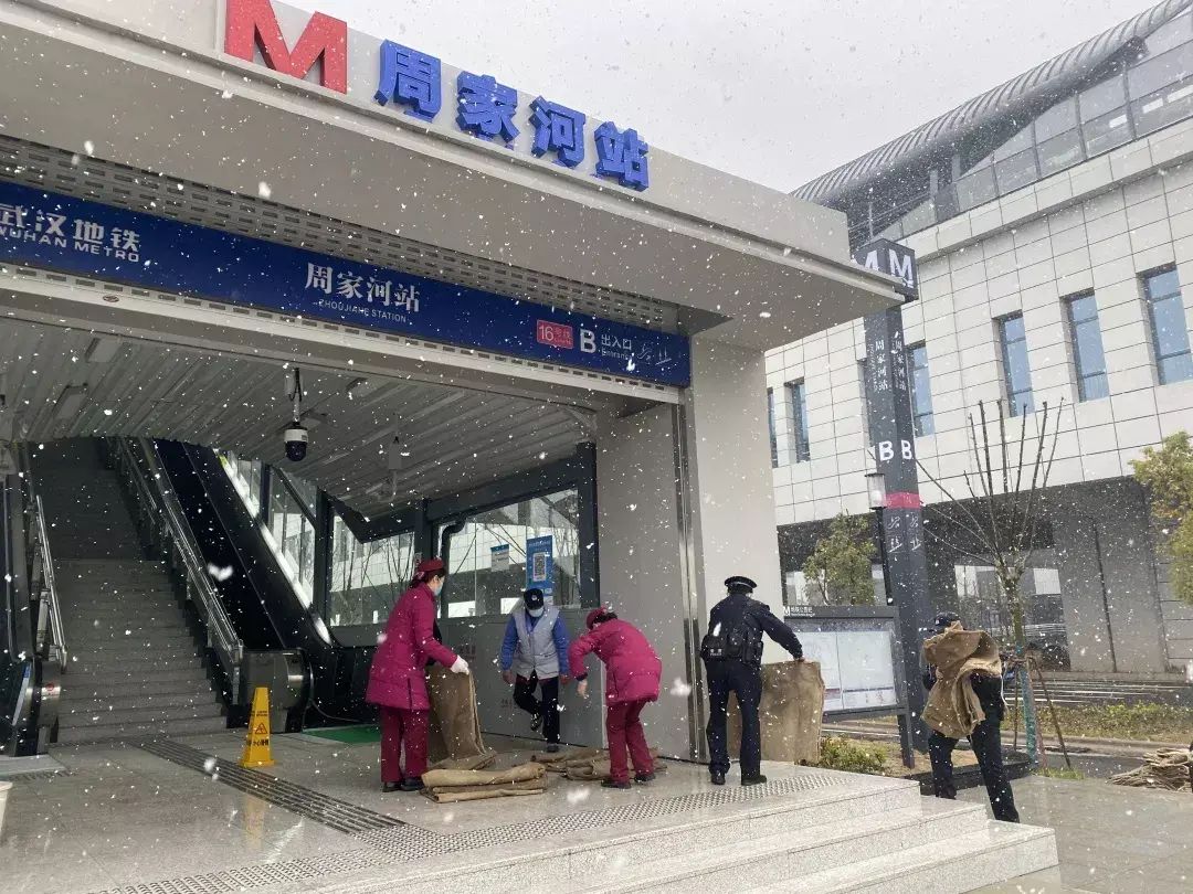 中午11时30分,在1号线径河站、4号线孟家铺站、阳逻线、16号线桂子湖站和周家河站等高架站,工作人员提前一天已经备好各种应急物资。中午看见空中飘雪,立即铺设麻袋。