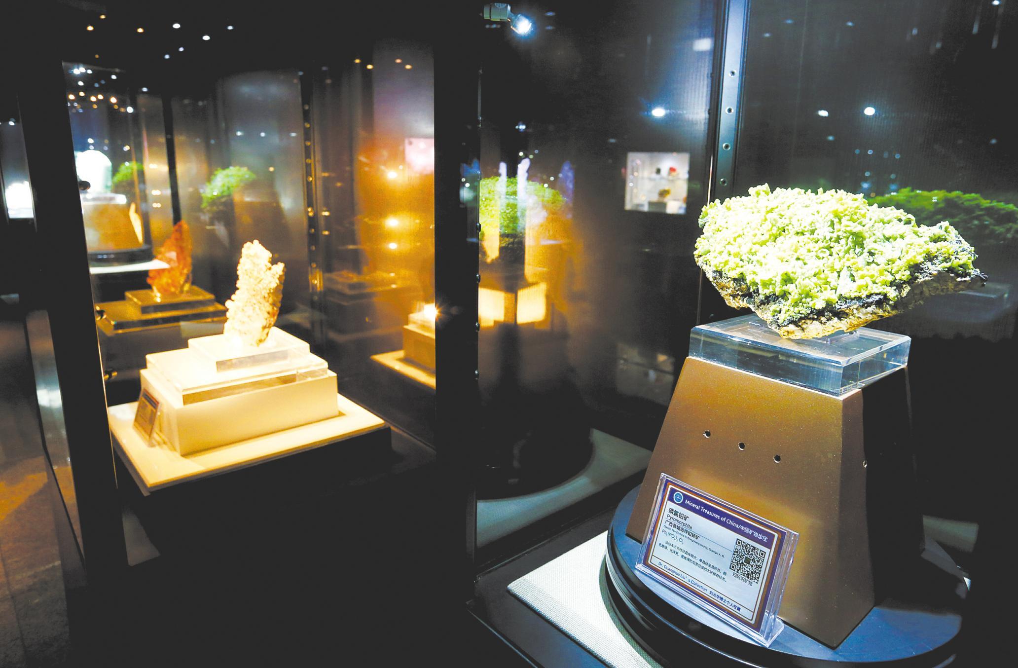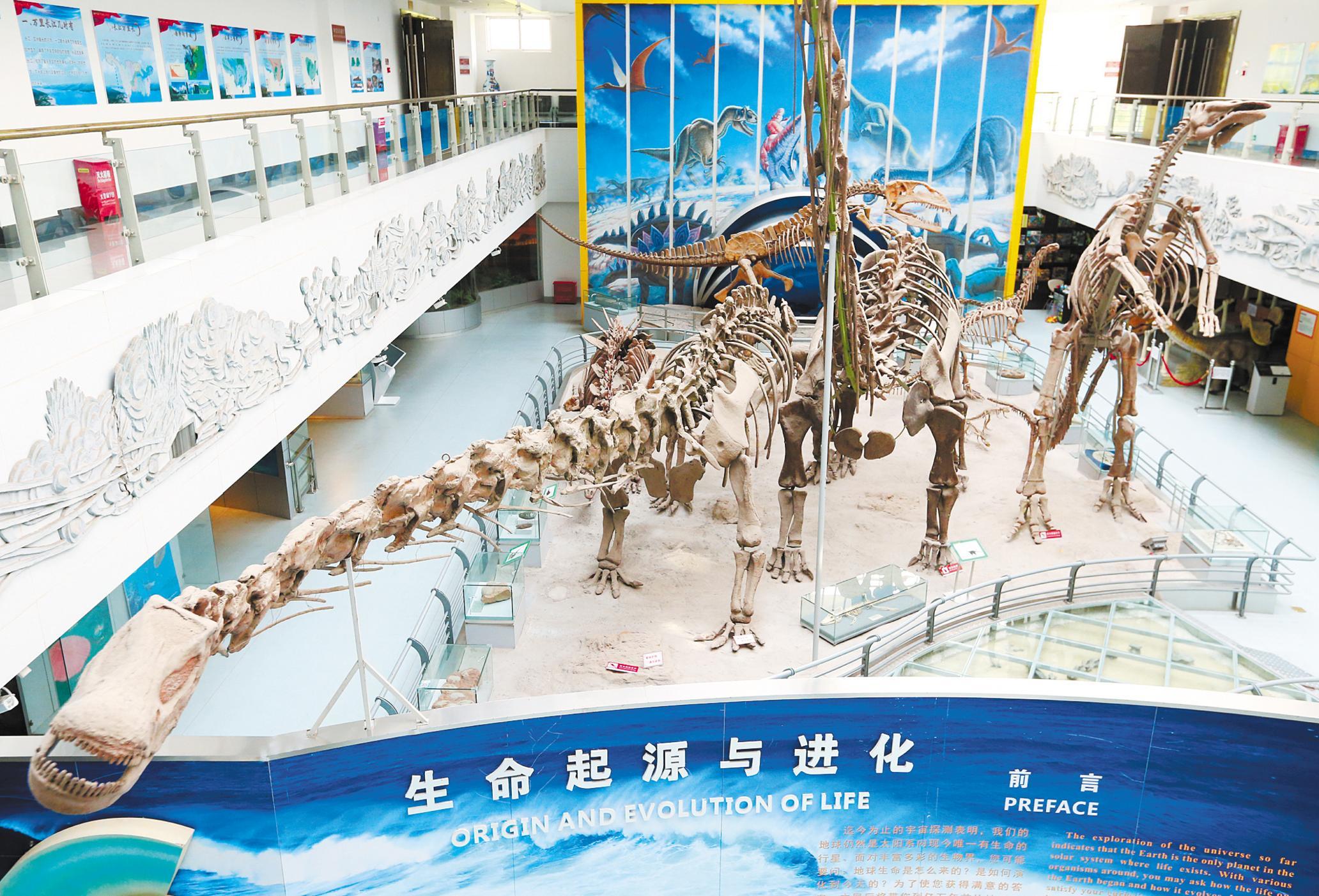 近日,中国地质大学逸夫博物馆入选首批全国科普教育基地,该馆建筑面积1万平方米,主要展出矿物、岩石、古生物化石等地质标本4万余件,包括黑龙江东北龙、和平永川龙、鹦鹉嘴龙等恐龙骨架化石在内的罕见珍品3000余件。右图为距今1.5亿年的恐龙骨骼化石标本。上图为展出的稀有矿石标本。