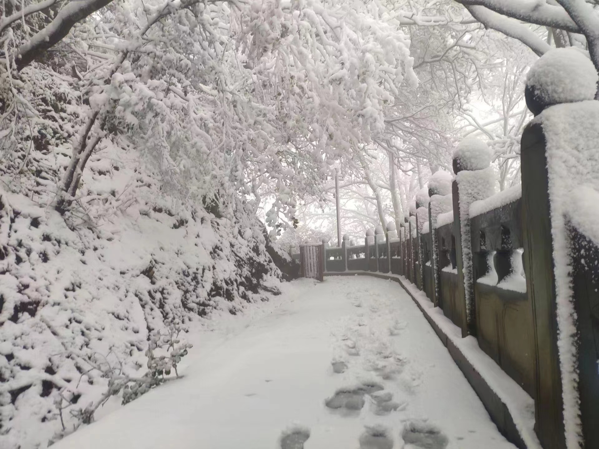 白雪却嫌春色晚,故穿庭树做飞花。今晨的武当山金顶景区雪依旧再下,经过一夜的低温天气,雪已经积了起来。簌簌飞雪渐渐给景区笼上一层纯白,盘山公路、庙宇道观统统都被白雪覆盖,皑皑积雪与白云呼应,为春后的武当重填了一抹冬日的纯净。